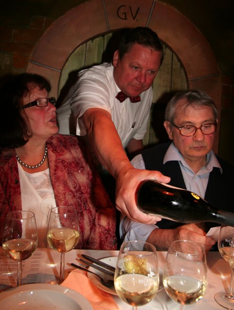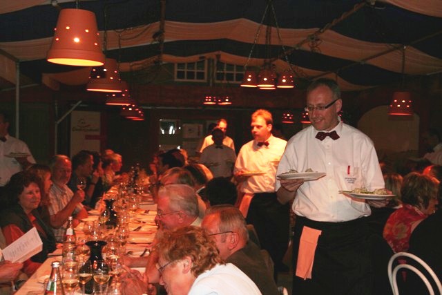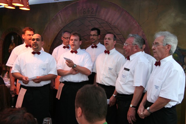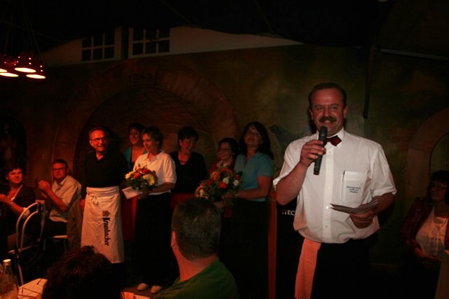 Mudau. Melonen-Spiesschen mit Beckksteiner Kirchberg Riesling Sekt trocken, hergestellt nach der Methode Champenoir, Gazzpacho mit Serrano-Crouton dazu rubinroter Spätburgunder Kabinett trocken mit dem Duft von dunklen Beerenaromen, gebratene Auberginen mit getrockneten Tomaten, Schafskäse und Pinienkerne oder Pflaumen im Speckmantel zu violettrotem, vollmundig samtigem Schwarzriesling Kabinett mit intensiven Beerenaromen oder Chili-Erdbeeren zu Gerlachsheimer Herrenberg Spätburgunder Spätlese trocken im Barrique ausgebaut – die Kombinationen waren so ungewöhnlich und harmonisch, dass selbst eine echte Weinkennerin wie Silvia Vögtlin von der Becksteiner Weingenossenschaft regelrecht ins Schwärmen kam. Zusammengestellt hatte die kulinarische Weinprobe, die mit großem Erfolg zum zweiten Mal vom Gesangverein „Frohsinn 1842“ Mudau in Kooperation mit Mudau G’schmackvoll in der Sängerlaube präsentiert wurde, ein Kompetenzteam des Gesangvereins unter Leitung von Stefan Schäfer sowie die eingespielte Familiencrew von Küchenchef Freddy Platteck. Mit viel Liebe zum Detail kredenzten die Sänger einem echten Genießer-Publikum neben sieben Runden Edelweinen – insgesamt 11 Becksteiner Erzeugnisse – und den dazugehörigen kulinarischen „Bonbons“ auch die passenden literarischen, musikalischen und komödiantischen Zwischenmalzeiten mit Harald Grimm, der Sängerrunde „Winzerchor“ sowie Uwe Lenz und Helmut Korger jun. Mit diesem Rahmenprogramm trafen die Verantwortlichen das Tüpfelchen auf dem i, das einen genussreichen Abend in die Riege „Kurzurlaub“ und „Seele baumeln lassen“ einstufen kann. Während Harald Grimm mit großem schauspielerischen Talent und Harald Hurst auf den Weihnachtsmarkt zu dem „mit de Worscht“ entführte, philosophierten der vornehm, charmante Jaques aus Fronkreisch (Uwe Lenz) und sein bodenständiger Wirtsfreund vom „Löwen“ (Helmut Korger jr.) über die Leidenschaft des Weingenießens oder einfach des Weintrinkens und animierten das Publikum dabei sehr erfolgreich zum Mitsingen. Ganz einfach entspannend war der musikalische Genuß, den der „Winzerchor“ mit seinen wundervollen Stimmen und dem Vortrag lustiger bis poetischer Weinlieder bot. Und schließlich bewies Silvia Vögtlin neben einem umfassenden Wissen über Wein, seine Herstellung und Historie auch eine ganze Menge Kenntnis über Weinanekdoten oder Ratschläge in gleicher Richtung. So z. B. „behandelt Sorgen wie den Wein, denn auch Wein will abgelagert sein...“ oder „Wie bei der Freiheit ist beim Wein das rechte Maß gesund“. Und doch war es für viele eine Überraschung, wie sich der Geschmack eines Weines im Zusammenhang mit einer bestimmten Speise verändern kann. Da wurde beispielsweise eine sehr junger und noch unruhiger Weisser Burgunder Kabinett trocken durch Rucola-Nusscreme eine fast samtige Angelegenheit und Silvaner Kabinett trocken harmonierte in erstaunlicher Weise mit Jakobsmuscheln und Grünem Apfel-Sauerampfer-Salat oder Fischterrine im Wirsingmantel. Und während ein füllig, dichter, geschmeidiger, eleganter Grauer Burgunder Trocken geradezu mit Entenbrust und Orangenfilets verschmolz, genoss der Frische Spargel in Roastbeef-Röllchen den Müller-Thurgau Spätlese trocken mit seinem zartwürzigen Muskatton, der sich vollmundig, füllig, aromatisch und mit fruchtiger Säure präsentierte. Weiter erfuhr das interessierte Publikum, dass der Blanc der Noir mit seiner zarten Herbstlaubfarbe ein Weißwein aus roten Trauben und schon deswegen mit kräftigen Burgunderaromen versehen ist. Auch wenn er zu vielen Speisen passt, war doch der Ziegenfrischkäse auf Feigen mit roten Pfefferbeeren dazu ein echter Hit. Dagegen stellte sich der Graue Burgunder Marbacher Frankenberg hundertprozentig hinter die Stein-Champignons mit Spezial-Dip. Die abschließende Käseplatte mit Weintrauben-Walnuss-Salat und Honig-Balsamico-Marinade war mit der Riesling Auslese Becksteiner Kirchberg ebenso zufrieden wie mit der Ruländer Auslese Gerlachsheimer Herrenberg. Und die Gäste zeigten ihre Begeisterung über den Abend mit begeistertem Beifall für Sänger- und Küchencrew mit Weinexpertin sowie das ganze Organisationsteam, nachdem Stefan Schäfer sowohl Freddy Platteck und seinen Heinzelmännchen also auch Silvia Vögtlin seinen Dank mit einem Präsent ausgesprochen hatte.