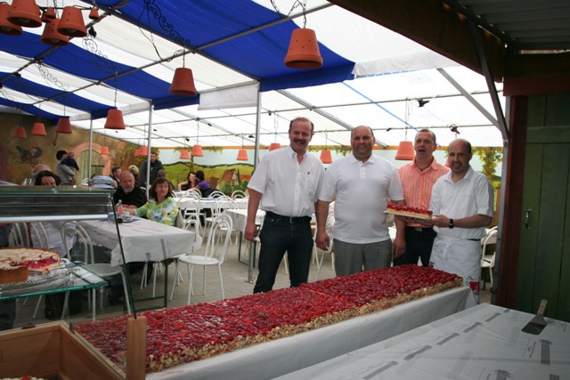 Schlemmen, schlemmen und kein Ende – so könnte manch einer am vergangenen Wochenende in Mudau gedacht haben, aber dann war es vermutlich kein Mudauer. Denn die wissen, wie man das Leben und das, was es einem bietet genießt. Und wenn das Angebot mal nicht so üppig ausfällt, dann fällt denn Mudemern ganz sicher etwas ein. Und so gab es beim Gesangverein „Frohsinn 1842“ in der Sängerlaube nach der unbeschreiblichen kulinarischen Weinprobe am darauf folgenden Pfingstsonntag gleich noch eine süße Versuchung für die ganze Familie. „Mudau G’schmackvoll“ war mit dem Team Peter Schlär von der gleichnamigen Landbäckerei und Siegfried Brenneis von der Bäckerei Münkel seinem Motto wieder einmal zu hundert Prozent gerecht geworden. Denn die beiden hatten aus besten Zutaten, darunter 36 Pfund Erdbeeren den 2,31 Meter langen und 80 Zentimeter breiten „Odenwald-Super-Rekord-Erdbeerkuchen“ gezaubert und der Sängerlaube damit einen Sonntäglichen Magneten geliefert. Uwe Lenz dankte den beiden Kuchenexperten – auch im Namen des 1. Vorsitzenden Stefan Schäfer – für ihren lobenswerten ehrenamtlichen Einsatz im Dienste von Mudau G’schmackvoll und den Mudauer Genießern und erläuterte fachkundig, dass die Erdbeere ein Rosengewächs sei (sieht man doch –oder?) und zur Gattung der Sammelnussfrüchte zählt. Letztere Aussage wollte man jedoch nicht vertiefen, sondern lieber den ansprechenden Kuchen mit Schlagsahne genießen. Und es dauerte kaum eine Stunde bis 2,31 Meter Rosengewächs-Sammelnussfrüchte-Spezialität den örtlichen Gourmets aller Altersklassen „zum Opfer“ gefallen waren. (L.M.)