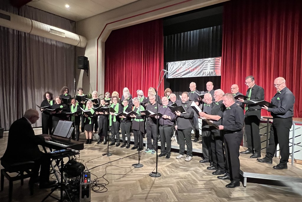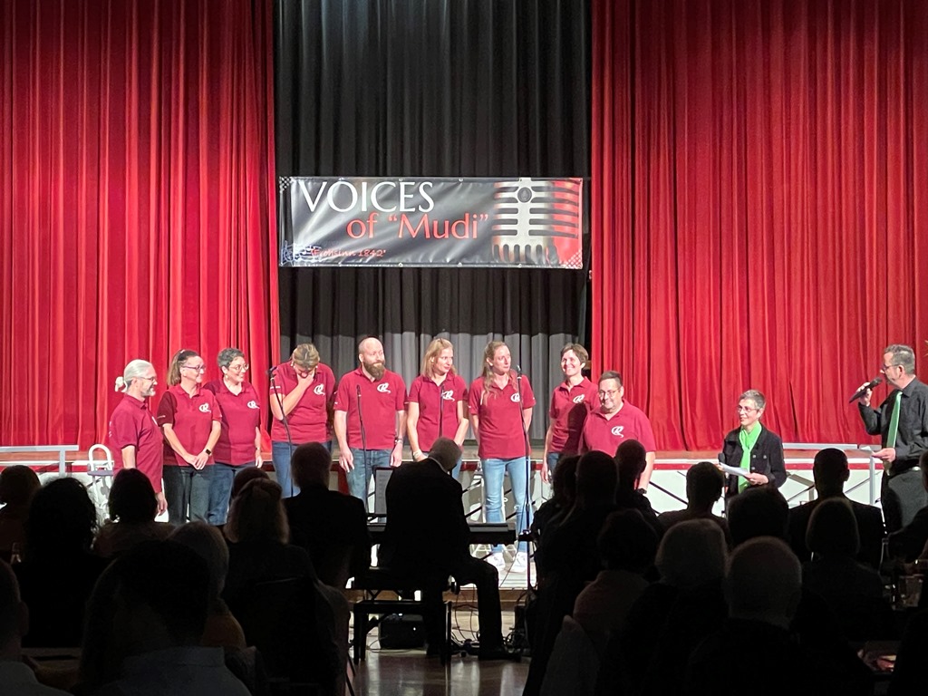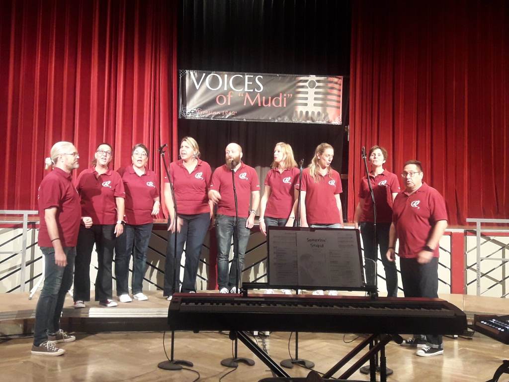 Vor rd. zwei Jahren hat sich der Projektchor „Chor ist cool“ unter dem „Dach“ des Gesangverein „Frohsinn 1842 Mudau“ zusammengefunden und sich in Rekordzeit zu einem respektablen Klangkörper entwickelt, der kein Problem hatte, sein Publikum in einem dreistündigen Konzert zusammen mit dem Acapella-Meister Chor Royal bis hin zu Stakkato-Klatschen und Handybeleuchtung von den Stühlen zu holen. Allerhöchste Zeit, „dem Kind einen Namen zu geben“. Aus der Erinnerung des verschmitzt-humorvollen Moderatoren-Paars Anja Henn und Uwe Lenz hat diese Namensfindung bei über 30 kreativen Menschen ein wenig mehr Zeit gebraucht, aber schließlich einigte man sich auf „Voices of Mudi“, und was die alles unter ihrem Dirigenten Gerhard Bönig zu Gehör bringen können, bewiesen sie in der nahezu ausverkauften Odenwaldhalle ihrem restlos begeisterten Publikum, darunter neben Bürgermeister Dr. Norbert Rippberger und Ortsvorsteher Stefan Galm auch die Sängerkreisvorsitzende Hilde Berner.